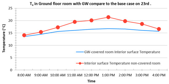 Interior surface temperature Ts for GW-covered room compared to the interior surface of the base case on 23 November.