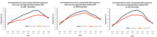 Results of air temperature (Ta) for ground floor rooms (with GW and without GW) on 24 and 30 November and 2 December.
