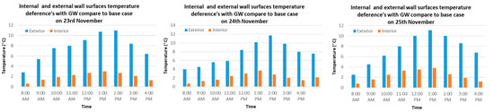 Internal and external wall surfaces temperature differences in a room with GW compared to the base case without GW on 23, 24, and 25 November.