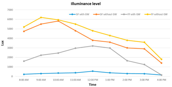 We investigated the impact of the green wall on daylight performance and shading performance by measuring hourly illuminance levels, as shown in Figure 13. The highest outdoor recorded illuminance level was at noon (12:00 p.m.) with 65,235 lux on a sunny day. Measured illuminance levels at the ground floor with GW did not exceed 500 lux due to the large cavity between GW and the building on the ground floor, while there was an illuminance level of about 3000 lux on the first floor with a GW with a small cavity. Recommended lighting levels are between 150 lux (general activity) and 500 lux (focused activity; reading) [29]. The green walls helped to control the high illuminance level in the study rooms compared to rooms without GW on both first floor and ground floor. It helped to reduce the illuminance level from around 600 lux to 3000 lux on the first floor and around 500 lux on the ground floor with a large cavity. Therefore, green walls helped to improve both the quantity and quality of daylight by improving the uniformity, minimum to maximum illuminance level, and thus reducing the glare and high level of daylight. Daylight study proved the importance of design of the green wall variables, such as foliage and cavity the distance between GW and the building, along with studying the shading effect of the other building or building elements, such as cantilevers, as seen in Table 4.