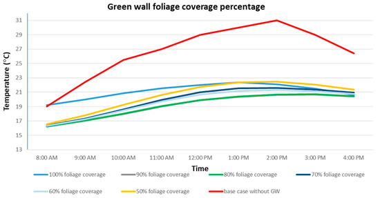 Different plant coverages and foliage parentage were investigated in order to optimize GW performance and develop design guidelines. The six studied scenarios with foliage percentage varied from 100% to 50%, and the impact of different foliage on surface wall temperatures, Ts, were recorded and compared to the field measurement of GW-covered wall surface temperature, as seen in Figure 14. The first scenario of around 50% foliage coverage had a low percentage of foliage coverage and recorded an average Ts reduction of 5 °C, while the green wall with around 60% foliage coverage recorded an average of 6.5 °C. It is obvious from Figure 14 that increasing foliage coverage increases the effectiveness of the GW shading effect, which means the thermal performance of the ambient environment. On the other hand, increasing the foliage coverage by more than 80% will slightly improve the heating gain and shading performance of the green wall in summer on account of the other indicators such as daylight and view. Moreover, high foliage coverage decreases the airflow rate, which reduces heat loss/gain through convection and covering the building’s opening will decrease the natural ventilation rate with the building’s surrounding environment. It also blocks solar radiation from reaching the building in winter, thus increasing the heating load, and blocks natural lighting and direct sun rays, besides the additional structural and cost issues. Therefore, around 60% converge, which is close to the real experiment percentage, represents the best average for thermal performance and shading, and it was used in the next section for further optimization in studying the air cavity.
