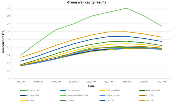 In the simulation process, the cavity for sceneries 0.0–0.1 m scenarios represent a green wall attached directly to the wall (direct green wall) by climbing plants, or on a mesh attached to the wall with distance varied from 0.02–0.1 m, while a green wall with a cavity of 0.2–1 m represents a green wall as a double skin façade. The cavity air depth for the attached GW from 0.04–0.1 m achieved the best temperature reduction with a slight change in values from 0.02 m to 0.1 m. On the other hand, indirect GW (as a double skin facade) with a cavity of 0.2–0.8 m achieved the best result for air temperature and surfaces. As a result, a wide cavity means the possibility of more direct heat gains, on the original façade, from the sun and sky vault and surrounding ambient environment. At the same time, very narrow widths mean less chance for good air circulation which helps to reduce the temperature of the wall (Figure 16).
