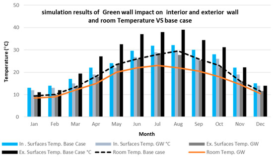 Simulation results of optimized green wall for interior and exterior wall surface and room Temperature compared to the base case with GW.