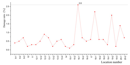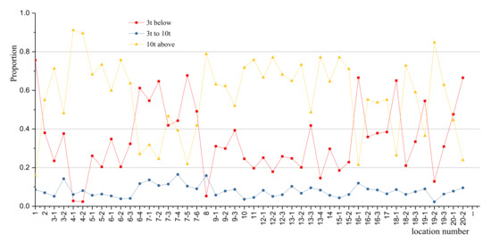 The calculation results are shown in Figure 7. It can be seen that the highest ratio of REFD was only 2.6% (location of “16-1”) while the ratio of the corresponding vehicle flow was 35.6%. So, it is reasonable to ignore the fatigue damage contribution of vehicles that were under 10 t in fatigue analysis.