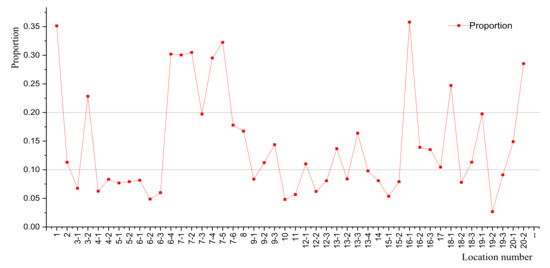 The statistics showed that, as shown in Figure 2, the proportion of light vehicles and heavy vehicles varied greatly among the different locations that were under investigation, without obvious regularity. The proportion of medium vehicles was always low, with an average of about 8% and a maximum of 15.9%. However, as shown in Figure 3, the proportion of the “medium vehicles” was up to 35.8% (S26 Expressway located in Jiangsu Province, eastern China) after eliminating the light vehicles, and the values at half of the locations were more than 10%. Therefore, it made no sense to ignore the fatigue damage of medium vehicles from the perspective of traffic flow, only the data of light vehicles were omitted temporarily in the subsequent discussion.