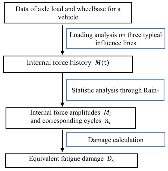 The equivalent fatigue damage of the standard vehicle (JTG D64-2015) or a typical representative vehicle in the fatigue load spectra can be calculated according to the steps in Figure 4.