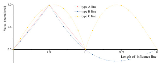 Firstly, the section internal force (section moment) history of the vehicle is obtained by the influence line loading. For general consideration, there are three kinds of influence-line shapes [17], which, respectively, are the bending moments at three critical sections, namely the mid-span section of simply supported girder, the mid-span section, and the mid-support section of two equal-span continuous girder, and can be recorded as “type A line”, “type B line”, and “type C line”, as shown in Figure 5. The characteristic length of the influence lines (L) varies from 1m to 100 m (L= (1.0 1.2 1.5 2 3 4 5 6 7 8 9 10 11 12 14 15 16 18 19 20 30 50 75 100)).