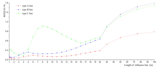 The calculation of REFD is completed by MATLAB (Version: 9.5.0). The relationship between the REFD of the standard vehicle () and the influence line is shown in the Figure 6, which indicates that:
