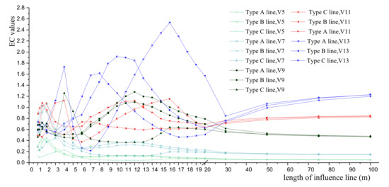 The calculated EC values (Vs “length of influence lines”) of partial typical vehicles are shown in Figure 8. It can be seen that the EC values of the same typical vehicle are dominated by the shape and length of the influence lines.