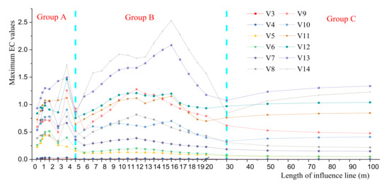 For the convenience of analysis and discussion, three EC curves with different influence line shapes can be merged into one through extracting the maximum values. As shown in Figure 9, from which it can be found that each revised EC curve has two relatively significant peaks, which are approximately located in the intervals of 0 to 5 m and 5 to 30 m, as the length of the influence line is within 30 m. Therefore, the EC values for each typical representative vehicle can be divided into three groups according to the length of influence line: 5 m below (Group A), 5 to 30 m (Group B), and 30 m above (Group C).