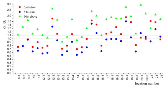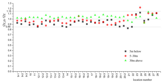 denotes the equivalent heavy vehicle flow that is calculated based on the fitting formula method that is given in Section 7.1. denotes the equivalent heavy vehicle flow based on the definition in Section 6.1. is obtained directly by damage calculation and can be considered to comply with the principle of fatigue damage equivalence. Therefore, can be used to verify the validity of the methodology that is given in Section 7.1. As shown in Figure 15. It can be seen that almost all the data fall within the range of 0.85 to 1.15. It indicates that the calculation deviation for the methodology that is given in Section 7.1 is within 15%. Compared with Figure 10, it can be concluded that that is obtained by the proposed method is obviously closer to than that is obtained based on the existing standards, and the possibility of underestimating the fatigue load is greatly reduced. The validity and advance are, therefore, proven.