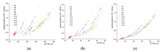 Relationship between the GVW and the representative EC values: (a) Group A; (b) Group B; and (c) Group C.