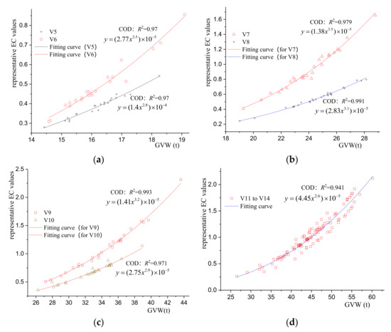 Based on the principle of the least square method, the fitting function of Origin Software (2017 version) is used to fit and analyze the relationship between the gross vehicle weight (GVW) and the representative EC values of each vehicle type in the investigated locations under different influence line lengths. The matching degree between fitting curve and the data is evaluated by the value of the coefficient of determination (COD) . The closer that the is to 1, the better the fitting curve that is fitted, and the better the fitting curve can explain the relevant data. Once it exceeds 0.9, it is generally believed that the fitting curve has a strong correlation with the corresponding coefficient.