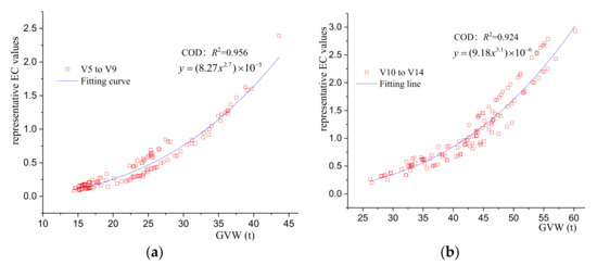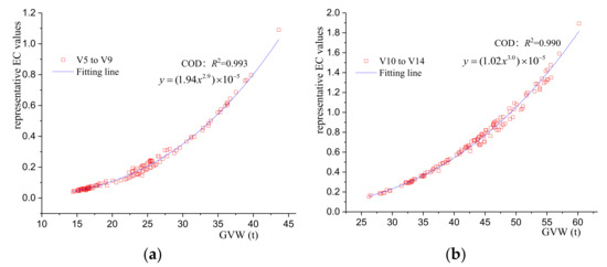 The formulas corresponding to the fitting curves in Figure 12, Figure 13 and Figure 14 reflects the mathematical relationship between the representative EC values (y) and GVM (x). For convenience, following the conservative principle, the fitting formulas with the same axle number of the vehicle are simplified and merged. As shown in Table 9, the representative EC values can be directly determined according to the number of axles and the GVM of the vehicle.