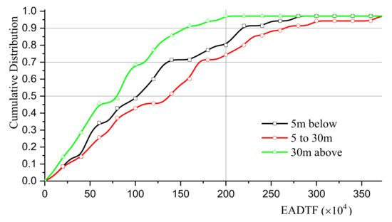 China’s current design code (JTG d64-2015) gives a suggestion for ADTF calculation through the proportion of effective vehicles (above 10 t) in the total traffic flow, which is divided into four levels to choose based on the road function and grade. However, it is no longer suitable for use when the concept of EADTF is adopted. Therefore, the grading suggestions of the design frequency in the slow lane that are based on EADTF are given in Table 10. Through the statistical analysis on EADTF in the slow lane at all the investigated locations (35 in total), the cumulative probability distribution of the change of the slow-lane EADTF can be obtained, as shown in Figure 16. Then, the cumulative frequency of the EADTF corresponding to 50%, 70%, and 90% is taken as the three grades, as shown in Table 9. In the process of fatigue design, after calculating the EADTF that is based on the traffic investigation, the fatigue load level that is close to it can be conservatively selected as the design frequency of the standard vehicle. When the traffic survey data is not available, designers can also choose an appropriate fatigue design load level directly according to the traffic level, but more relative research should be conducted so that much clearer guidelines will be provided for designers.