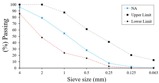 The aggregate used to make the mortars was river natural sand. Figure 1 shows the granulometry of the sands used in this investigation. The granulometric curve was obtained using the dried aggregate and a series of standardized sieves according to UNE-EN 933-2 with a mesh opening between 4.000 and 0.063 mm [45]. It was sought to obtain a continuous granulometry in order to improve the compactness of hardened lime mortars [46].