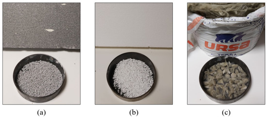 In this work, three different types of insulation materials from construction and demolition waste were used: expanded polystyrene insulation with graphite for use on facades (EPS-F); expanded polystyrene insulation for indoor use (EPS-I); and mineral wool insulation (MW), as shown in Figure 2.
