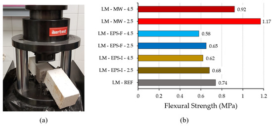 The mechanical resistance to bending was determined in standard 4 × 4 × 16 cm specimens that were filled with the mortar in two approximately equal layers, homogenizing each layer of the mixture with 25 strokes in the compactor following the UNE-EN 1015-11:2000/A1:2007 standard [63]. This test is of great relevance for lime mortars that are going to be used in restoration works as coatings, since the ability to withstand deformations without cracks appearing on their surface is greatly important [72]. To carry out the test, a press model AUTETEST 200-10SW was used with a uniform application of the load at a speed between 10–50 N/s. Figure 3 shows the test equipment and the results obtained for flexural strength in each of the mortars studied in this investigation.