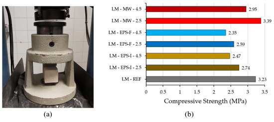 Compressive strength is one of the most decisive parameters when selecting a type of mortar for application on-site. This property depends on the internal cohesion of the mortar and reflects its ability to support loads without disintegrating [74]. In the case of hydraulic lime mortars, it is known that the mechanical resistance to compression increases with time [75], with the binder content, and with the use of continuous granulometry for aggregates [76]. This property is determined by applying a constant load of 1 mm/min without acceleration on each of the half-samples obtained after the flexural strength test. In Figure 5, the test method used and the results obtained are shown.