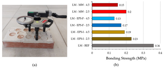 The bonding strength of a mortar can be defined as the property that allows it to remain attached to the ceramic surface that makes up the factory [79]. To determine this property, the UNE-EN 1015-12:2016 standard clarifies that it is necessary to measure the maximum pull-out traction by direct load perpendicular to the surface of the mortar for rendering or plastering that has been applied on certain support [80]. When the adherence is greater, the mechanical energy of the interface between the mortar and the application surface can absorb; this property depends on various factors such as the type of binder, the dosage used, the degree of wetting of the support, and its type or the presence of salts in the masonry factory [81]. The results derived from this test and its method of performance are shown in Figure 6.