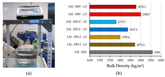 The density of hardened mortars depends on the individual densities of the different components that make them up. In this sense, one of the greatest advantages of incorporating expanded polystyrene insulation waste is the reduction in final density compared with traditional lime mortars [54]. To determine this property, the recommendations of the UNE-EN 1015-10/A1 [83] standard were followed. Figure 7 shows the hydrostatic balance weighing method and the results derived from this test.