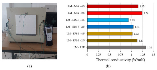 where LM refers to the type of material used, lime mortars with a cement/aggregate ratio 1:3; Type refers to the insulation material incorporated in the manufacturing, which can be expanded polystyrene recommended for use on facades (EPS-F), expanded polystyrene for interior use (EPS-I), mineral wool (MW) or reference without insulation (REF); and finally, Quantity indicates the incorporated mass in grams of each type of waste, which can be 2.5 or 4.5 g.