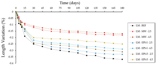 Finally, the durability tests that were carried out were: resistance to freeze–thaw cycles; salt crystallization; and shrinkage measurement. In the first two, freezing and crystallization of salts, the standards UNE-EN 12371 [66] and UNE-EN 12370 [67] were adapted for natural stone, respectively, using 4 × 4 × 16 cm series of test tubes and taking for each sample subjected to cycles, another equivalent without accelerated aging. The freeze–thaw cycles were completed 25 times (6 h freezing at −12 °C and 18 h saturation in water at 20 °C) and the salt crystallization cycles were completed 15 times (2 h in a solution of sodium sulfate decahydrate saturated with water), with 14% at 22 °C (drying in an oven for 16 h at 105 °C and cooling at 22 °C for 6 h). On the other hand, the shrinkage test was carried out on 25 × 25 × 287 mm specimens for 180 days following the UNE 80-112-89 standard [68].