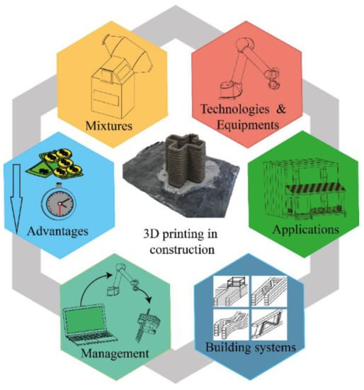 The introduction of innovations to conventional construction techniques requires the integration of a variety of expertise, such as civil, systems, electronic, and mechanical engineering; graphic design; and architecture. The contributions of these areas have focused on solving challenges related to structural design, the development of concrete-based materials, implementation of algorithms, optimization of 3D-printing models, and implementation of robust systems. Additionally, some studies have been oriented towards sustainable construction, considering that the introduction of 3D printing in this sector will allow for developing of new construction techniques based on eco-efficiency criteria.
