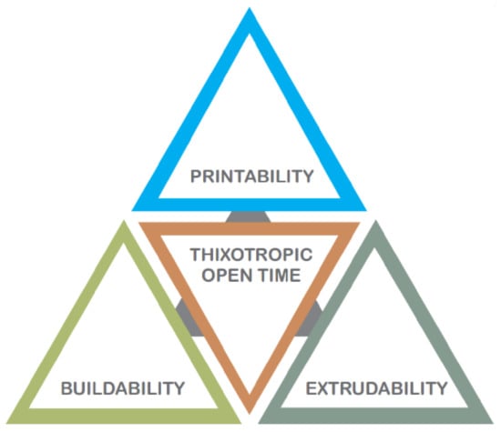 Material mixtures for 3D-printed construction must be designed according to the performance required for the elements to be executed, as well as to the extrusion process. This design process has been approached by [28] as sequential phases, because these progressively condition different aspects. For example, the structural requirements of the printed component and its integration with reinforcement determine the required mechanical properties and buildability factors. In turn, the pumping and extrusion technologies employed, along with the mixture’s storage and preparation method, require establishing additional parameters regarding the rheology of aggregates, the cementitious base, and the additives to be applied. These relationships condition the design of the appropriate mixtures for different sets of elements, equipment, and work contexts. Moreover, the design of mixtures is also conditioned by the interrelationship between the model design to be executed and a series of material and process parameters [29], as shown in Figure 2, considering an integrated structure between printability, buildability, and extrudability, centralized by the thixotropic open time, as expressed in Figure 3. This is complemented by the preparation and application processes, according to the standards and the necessary tests for the execution, as well as for obtaining the performance required for the building elements.
