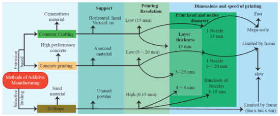 Currently, the available AM methods for 3D-printed construction are contour crafting, D-shape, and concrete printing. Contour crafting is a multi-material deposition technique, combining an extrusion process and a filling process to build a 3D object layer by layer [22,33]. In the case of the D-shape technique, the printing process involves depositing sand with a binder to form a 3D structure [36,37]. Concrete printing is a technique with cement mortar extrusion to build a 3D layered model without using formwork [38,39]. Figure 4 presents a summary of the characteristics of AM methods in large-scale processes, which will be explained in detail.