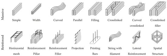3D-printed mass and reinforced concrete approaches [40,56,76,80,83,86,87,89].