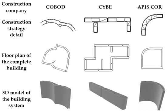 It is possible to recognize a relevant evolution of the construction systems in videos and dissemination actions by western companies that have carried out more than one printed building (see Figure 6). These constructions maintain their strategy based on parallel cord-based hollow walls, with sections presenting reinforcement at the ends with a double cord or rectangle and a straight, diagonal, or lateral grid, apparently to ensure stability during execution. Thermal or acoustic performance are considered independently, as well as higher resistance capacities, which evidence progress in the modular strategies of execution, according to the amount of materials and location of equipment.