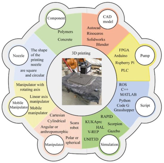 The management of the manufacturing and supply chain has enabled the 3D-printing production processes. In this sense, an efficient and flexible control can improve the quality of construction of 3D-printed buildings [4,82]. The additive manufacturing management process considers the robotic platform, a power distribution substation, the design software, and the print nozzle. The final quality product with pre-established design features is obtained by correctly synchronizing the devices involved in the 3D-printing process. Figure 7 shows an overview of the computer-aided design (CAD) software, programming software, robotic platforms, and nozzles used in the construction process.