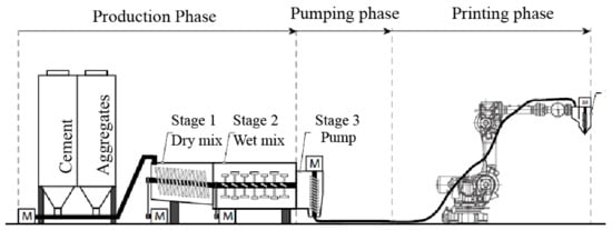 The AM processes and the materials handled are closely linked. Therefore, regarding the printing of construction elements, the focus of this section is on aggregate-based cementitious mixtures for elaborating concrete. Concrete has been extensively used in the construction industry because it is easy to process in its fresh state and has high compressive strength in its hardened state [11]. Furthermore, it is compatible with reinforcing steel, which improves its ability to resist the bending required by infrastructure and buildings. For these reasons, it is also the most frequently employed material in AM for buildings [8,12]. However, it usually requires using formwork and other supports, which involve preparation, transport, labor risks, noise, and an additional carbon footprint, among others. AM with concrete substantially reduces these aspects [9,11,12,13,14,15]. Therefore, its use in construction can provide great advantages to the current building industry. For the extrusion of concrete, the materials and process-related parameters cannot be defined independently, as they influence each other. Moreover, new properties, such as pumping capacity, extrusion capacity, layer bonding, and building capacity, must be controlled [16]. The following summary provides the main background on these aspects.