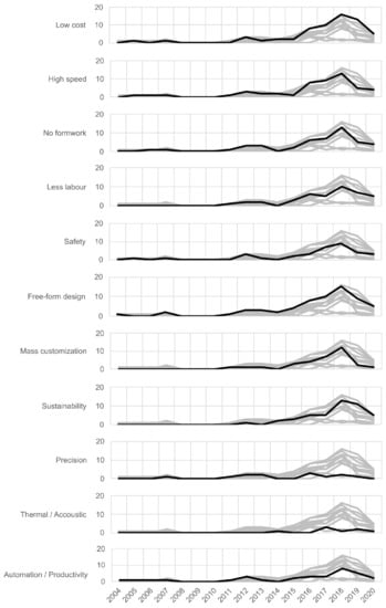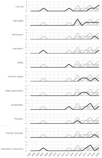 The aforementioned studies mention advantages and/or some potentials of this technology related to specific capabilities or experiences without analyzing them exhaustively. For example, they repeatedly refer to the capacity to execute elements directly on-site, such as at the factory (i.e., off-site), with these being opposite approaches, which imply different procedures and strategies that are not differentiated. Furthermore, some studies state that 3D-printed construction can be applied in dangerous environments and highlight the relevance of this technology for war or recovery situations from catastrophes due to its speed and reduction of manpower needs. Likewise, it is frequently stated that this technology can be used to execute new buildings or to repair damages in existing ones. However, only a few strategies have been thoroughly described. Additionally, some researchers declare that 3D-printed construction is useful for making elements with specific characteristics, for example, structurally optimized; thermal- or acoustic-resistant; or with non-repetitive elements, characterized for their variability, adaptation to unique requirements, or high precision.