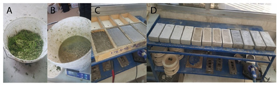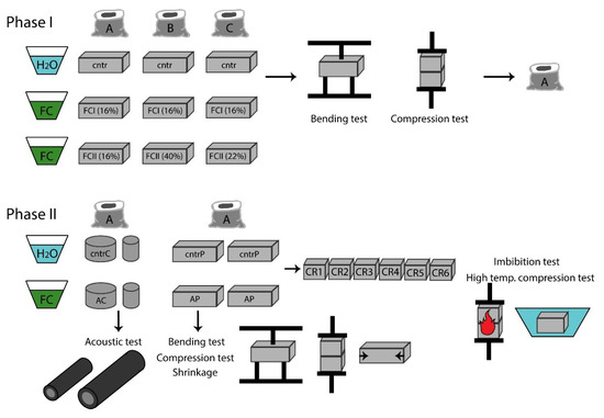The experimental setup is summarized in the flow chart of Figure 1. Organization of work steps was done based on consultation of appropriate literature papers [31,32]. Briefly, a preliminary investigation was performed to settle the most suitable binding agent for a novel fennel-based composite material (phase I). After having defined the water content of fennel (%), three cement mortars (A, B and C) were tested. A total of 36 samples (see Section 2.3.1) were employed. The most appropriate combination was determined with compression and bending tests. Hence, a detailed physical and mechanical characterization of the obtained bricks was performed (phase II). For that, two sets of samples were prepared: (I) 24 parallelepiped samples for bending, compression and shrinkage tests. Four of these samples were cut and reshaped into 6 equally sized bricks and employed for imbibition and high temperature compression tests; (II) 12 cylindrical samples for acoustic tests (see Section 2.3.2).