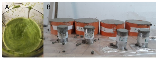 A total of 36 samples (Table 1, Figure 1) were prepared with one of three commercial cement mortars. Each matrix was combined with either water or FC to cast the following set of samples: (I) Control samples (cntr): 4 specimens/mortar. These samples were prepared by adding 16% tap water to the appropriate cement powder; (II) FC I: 4 specimens/mortar. In this case, exclusively the water obtained from fennel centrifugation was employed. To have a solid comparison between the obtained products, a fixed percentage (16%) was chosen. Such percentage was defined as the smallest value among the producers’ indications of each cement matrix; (III) FC II: 4 specimens/mortar. The samples were prepared by replacing the percentage of water indicated by the producers with FC (16% for mortar A, 40% for B and 22% for C) (Figure 2).