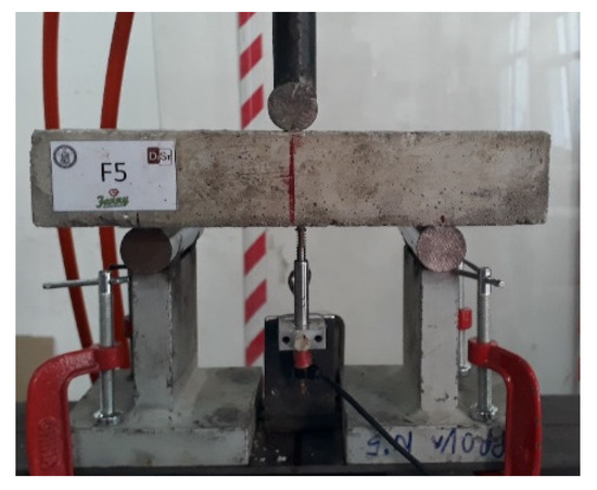 Three-points bending tests were carried out with a 500 kN MTS 810 Universal Machine (Germany), as regulated by UNI EN 12390-5:2019 [34]. All 36 phase I- and 9 phase II-samples (3 cntr- and 6 FC-bricks) were tested for potential use in seismic areas. A concentrated force (loading speed v = 0.005 MPa/s) was applied in the middle of the specimen, which was constrained at the ends by two cylindrical supports. The distance between the support pins was 150 mm and the samples were perfectly centred inside the testing machine (Figure 4). In addition to measuring the displacement of the upper loading tool, a transducer located under the specimen reported the downward shift of the brick (Figure 4).