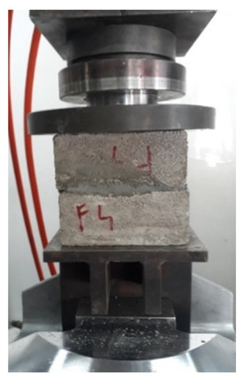 The compression tests were carried out with a 500 kN MTS 810 Universal Machine (Germany), as regulated by the UNI EN 12390-3:2019 [35] standards for bricks (Figure 5). The top plate was designed to automatically align with the specimen. The load was increased at a speed of 50 N/s. The compressive strength was calculated by dividing the measured breaking load by the sample’s cross-sectional area.
