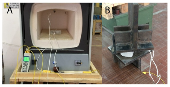 The samples were preheated at 200 °C and 600 °C in a muffle oven (FM22, Falc Instruments, Treviglio, Italy) prior to regular compression tests (as described in Section 2.4.2). The purpose is to evaluate the influence of high temperatures on the mechanical performances of samples by simulating a fire scenario. A pilot test was carried out to identify the procedure timing and potential temperature fluctuations. Three heating cycles were carried out on the cntrP4_CR1 specimen. The following thermoelectric probes were prepared (Figure 6A): (I) T1, inserted inside the specimen to a depth of 5 mm; (II) T2, inserted inside the specimen to a depth of 25 mm; (III) T3, inserted in the oven for the acquisition of the contact temperature. The data acquisition continued outside the oven to gain the cooling trend of the bricks. To reproduce the most realistic conditions and evaluate the cooling resulting from contact with the compression press, the pilot specimen was extracted from the oven and placed between two steel plates. Thus, it was possible to infer the temperature at which the brick fails under the compression test (Figure 6B).