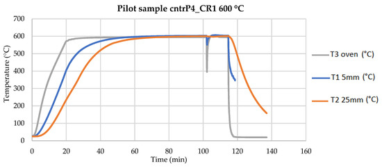 Figure 7 reports the pilot test with preheating at 600 °C. A temperature drop is observed after 102 min due to a voluntary opening of the oven. This was conceived to estimate the time required to restore the set temperature after extracting a sample.