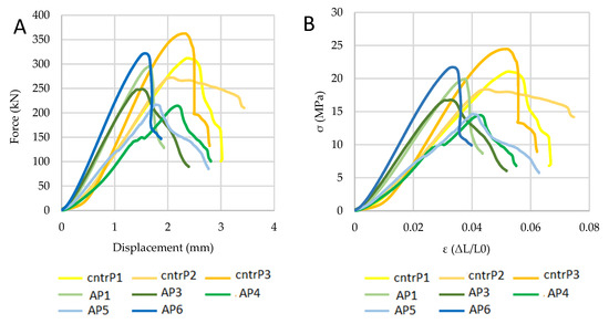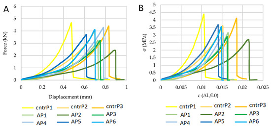 The bending tests (Table 9) revealed a 21% reduction of the average bending tensile strength Δfctf for the samples supplemented with fennel centrifugate. The load-displacement and stress–strain (σ-ε) diagrams are presented in Figure 9A,B. It should be noted that the results did not show substantial differences between the displacements measured by the transducer and those recorded by the loading tool.