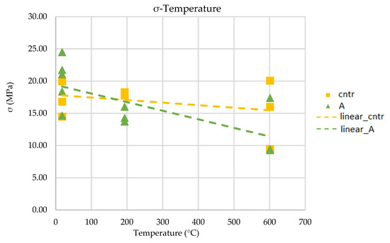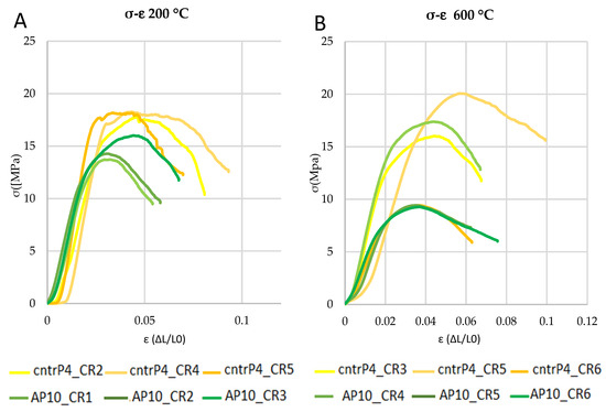 The obtained results were compared with the compression tests at room temperature described in the previous paragraph. The summary diagram of the trends is reported in Figure 12. The temperature decreased by 15% in control specimens and 35% in samples prepared with FC, along with the tension state. The specimens supplemented with FC presented stress values greater than 9 MPa at 600 °C, which overcomes the minimum resistance limit allowed in the seismic area (5 MPa).