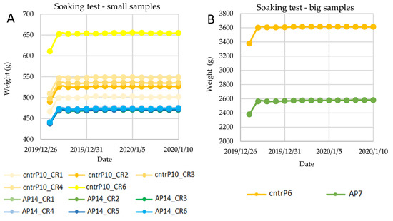 Soaking tests on small (A) and big (B) samples. Yellow indicates control- and green/blue FC-samples.