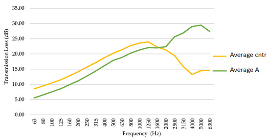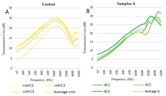 The TL curves present a similar trend. However, the curves of control samples are shifted towards higher frequencies, especially sample cntrC1. A possible explanation of this behaviour relies on the irregular circular shape of the specimens, which created gaps between the walls of the tube and the specimens. Future measurements can be improved by further reducing the specimen’s diameter and better sealing the edges when inserting the samples into the tubes. To facilitate comparisons between the two groups, the TL averages obtained at each frequency are plotted in a single graph (Figure 15).