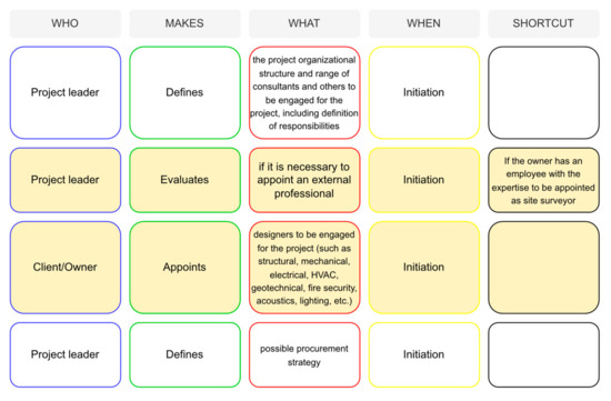 20]; it defined every activity undertaken by the several stakeholders during the different stages, and it described the outputs emerging from those activities. Then, according to EN 16310: 2013 [