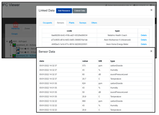 Within the BIM management system platform, the 3D model of one or more buildings can be viewed. The 3D model is subdivided in IfcZone, and after selecting an apartment, the different types of Internet of Things (IoT) sensors installed and their related identification codes and details can be visualized in a dedicated box. Then, users can investigate the 3D model of the building, monitoring its daily performances and current state and tracing any anomalies in real time (