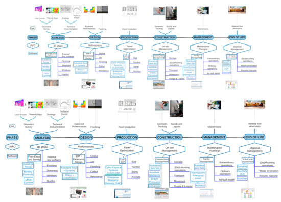 Figure 7). Based on the evidence from existing products (either on the market or developed in research projects), the flow describes the information typology, the task, the software, and the data type involved in each phase.