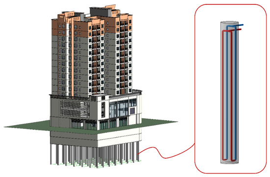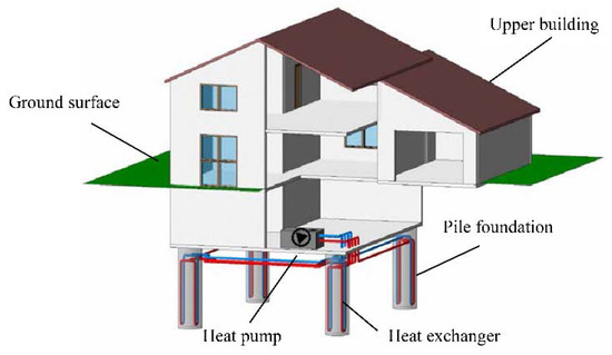 As a pioneering work of geothermal heat pump technology, Morino et al. [4] proposed the geothermal energy pile system (EPS), originally using renewable ground source heat to reduce building energy consumption of heating and cooling, in which the heat exchangers are generally set up inside the pile without additional costs of drilling and installing [5], as shown in Figure 1. Such a system transmits heat or cold from ground to buildings during winter or summer, respectively. Due to high heat storage capacity and thermal conductivity of a concrete pile, the geothermal EPS using renewable ground source has great energy efficiency without greenhouse emissions.