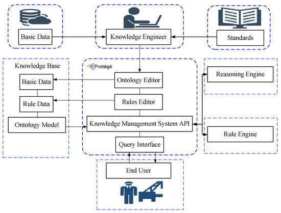 The OntoEPS includes four modules: namely, knowledge base (KB), ontology management system (OMS), rules editor (RE), and query interface (QI), as shown in Figure 2. The KB is the primary essential section of OntoEPS where the basic data can be saved as Ontology Web Language (OWL) files. The OMS provides editors to create and update the ontology model. An open source ontology software, Protégé 5.2, is used to implement the development of OntoEPS. The RE is generally employed to edit and run the Semantic Web Rule Language (SWRL) rules of the ontology model. In addition, the designer can also obtain related results by inputting specific demands from the Semantic Query Web Rule Language (SQWRL) query interface.